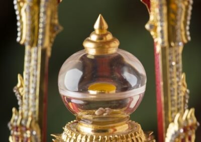 Les Reliques du Bouddha Shakyamuni, mémoire tangible de sa manifestation en notre monde, nous relient à son influence spirituelle. Méditer, réciter des prières de souhaits, se prosterner devant elles ou encore les circumambuler nous connecte aux aspirations atemporelles du Bouddha. Les bienfaits d’être en présence des reliques sont nombreux ; tant au niveau relatif de notre existence comme bénéficier de conditions favorables, comme au niveau plus ultime, en soutenant notre chemin vers la libération de la souffrance.