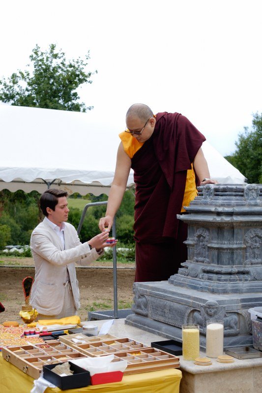 Remplissage du cœur du stoupa par son Éminence Jamgon Kongtrul Rinpoché