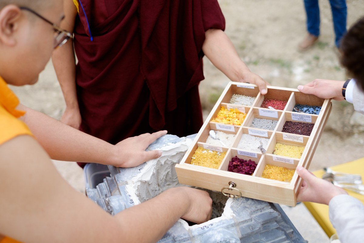 Remplissage de la base du stoupa avec son Éminence Trungram Gyatrül Rinpoché